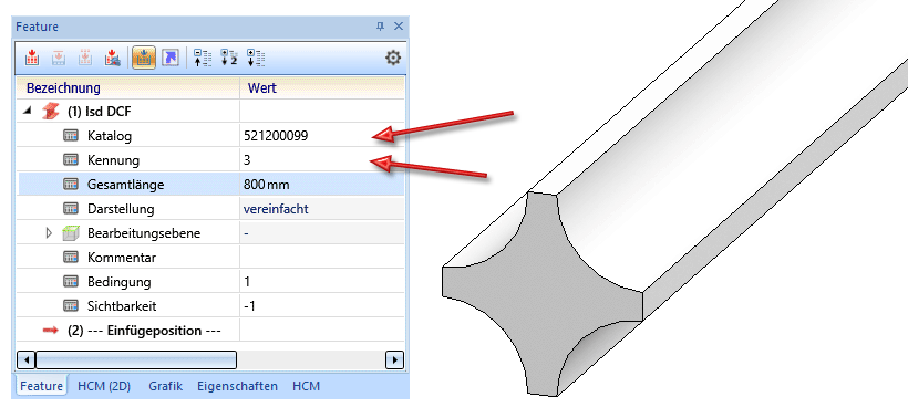 Beim Einbau von Baureihenprofilen über den HiCAD-Katalog werden die Tabellen-ID und die Datensatz-ID in das Feature-Protokoll eingetragen. Werden diese IDs im Featureprotokoll editiert und wird das Feature anschließend neu berechnet, dann werden dabei auch neue, den angegebenen IDs entsprechende Körper erzeugt. Anstelle der IDs können auch Variablennamen verwendet werden, wodurch Baureihenprofile jetzt im Feature parametrisierbar sind.