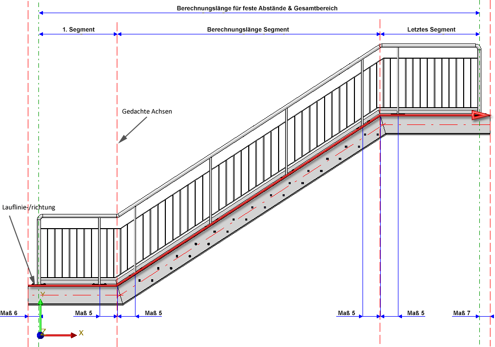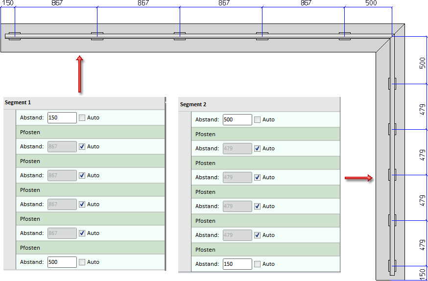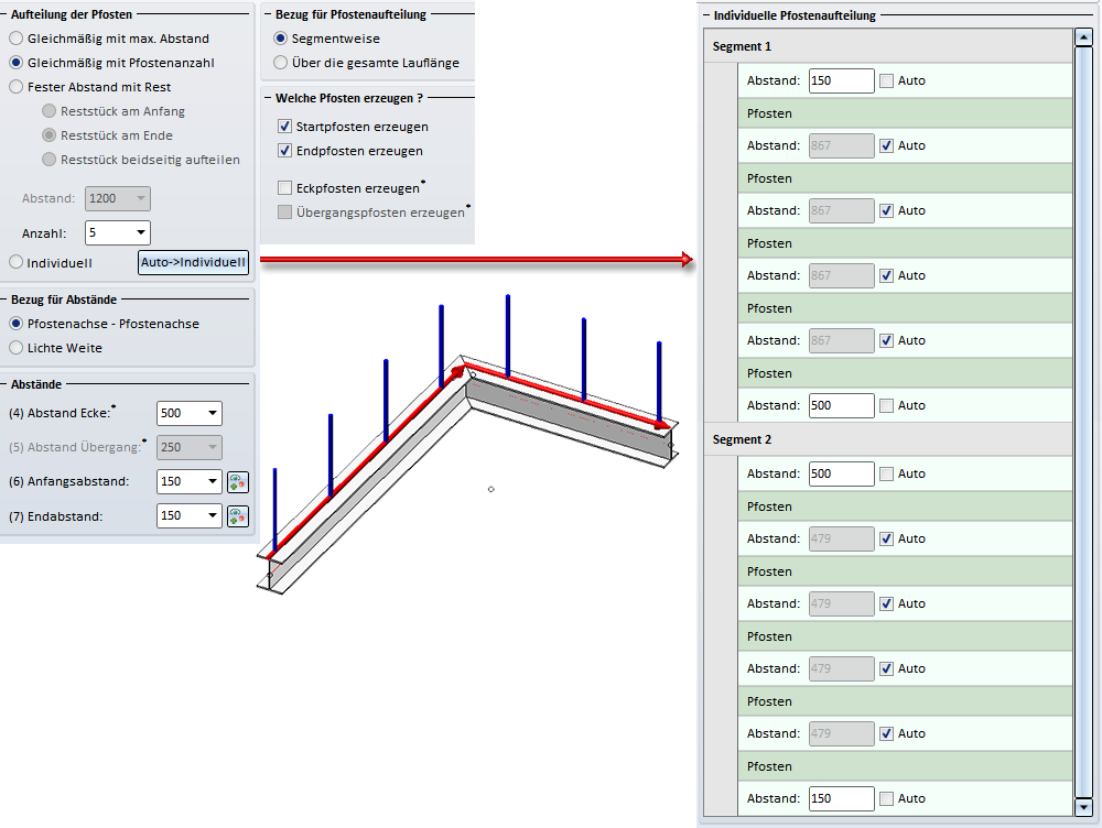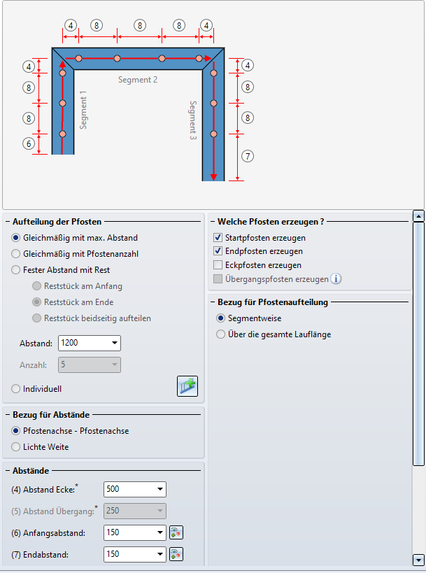 Die Aufteilung der Pfosten kann segmentweise oder über den gesamten Bereich erfolgen. Als Segment wird die Länge zwischen den gedachten Achsen, d. h. den Senkrechten in den Eckpunkten bzw. Knickpunkten der roten Lauflinie.