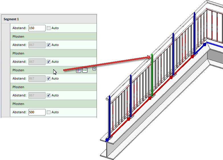 Wenn Sie den Cursor über die Pfosteneinträge bewegen, wird der zugehörige Pfosten in der Konstruktion grün hervorgehoben. Abstände zwischen den Pfosten werden rot, alle anderen Abstände blau markiert.