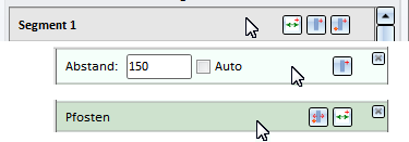 Über die Liste der Pfostenaufteilung haben Sie auch die Möglichkeit, neue Pfosten und Abstände einzufügen. Dazu stehen in der Segment-Zeile sowie in den Abstands- und Pfostenzeilen entsprechende Symbole zur Verfügung.
