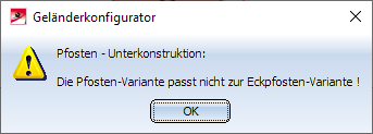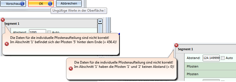 Lässt sich die Pfostenaufteilung mit den angegebenen Daten nicht umsetzen, z. B. weil zwischen zwei Pfosten kein Abstand definiert wurde oder weil ein Pfosten aufgrund der Eingaben außerhalb des Segmentes liegen würde,