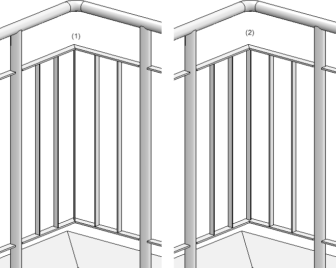 Die Einstellungen unter Eckpfosten/Übergangspfosten sind nur möglich, wenn auf der Registerkarte Pfostenaufteilung unter Bezug für Pfostenaufteilung die Option Segmentweise gewählt wurde und die Leitlinie Ecken bzw. Übergänge aufweist.