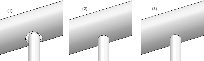 Bei Verbindungen von Rund auf Rund und Wahl der Option Rohre anschneiden kann der Parameter Breite des stumpfen Endes angegeben werden. Normalerweise entsteht beim Anschneiden von Rohren am angeschnitten Rohr eine Spitze (1). Mit dem Parameter Breite des stumpfen Endes (2) lässt sich hier festlegen, wie die "Spitze" am Pfostenrohr abgeschnitten wird.