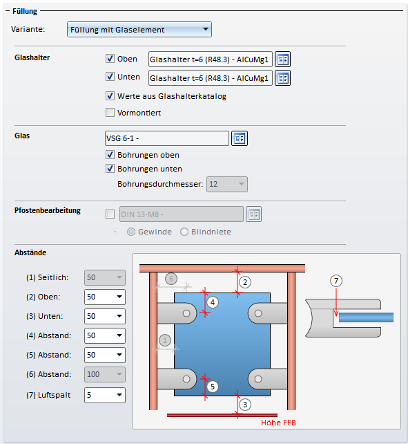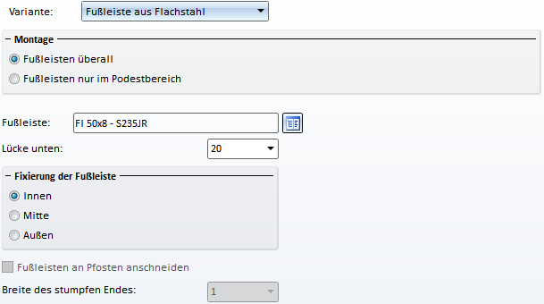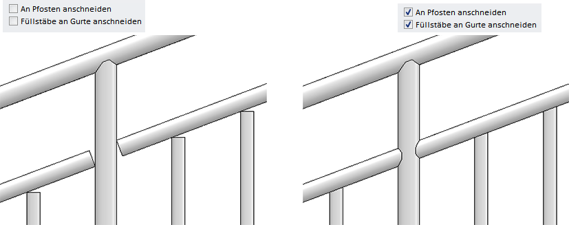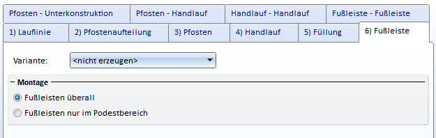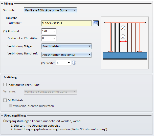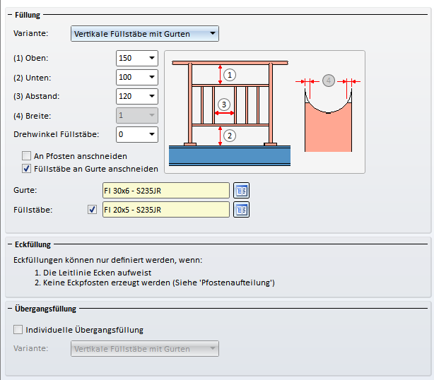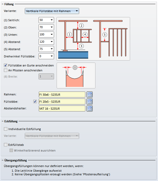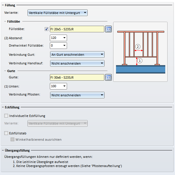 Als Füllung können hier wahlweise Knieleisten, Glaselemente, vertikale Füllstäbe mit und ohne Gurt, vertikale Füllstäbe mit Untergurt und vertikale Füllstäbe mit Rahmen verwendet werden. Die Füllung für Ecken und Übergänge (Treppe/Podest) lässt sich dabei getrennt definieren. Dies ist jedoch nur dann möglich, wenn die Leitlinie Ecken bzw. Übergänge aufweist und die Erzeugung von Eck- bzw. Übergangspfosten auf der Registerkarte Pfostenaufteilung deaktiviert ist.