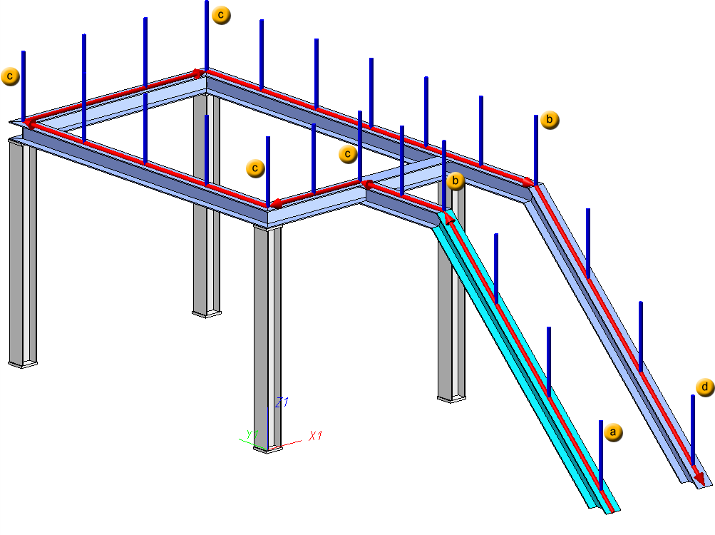 Nach dem Aufruf des Geländerkonfigurators fordert HiCAD Sie auf, nacheinander die Trägerprofile zu identifizieren, auf denen das Geländer verlegt werden soll. Durch den "Pfad", den die Profile bilden, wird quasi ein virtueller Kantenzug als Leitlinie für den Geländerverlauf definiert. Diese liegt immer in der Mitte der Profiloberkante. Pfosten, Handlauf, Füllung und Knieleiste des Geländers liegen dann auf einem zu dieser Leitlinie parallelen Kantenzug, der sogenannten Lauflinie.
