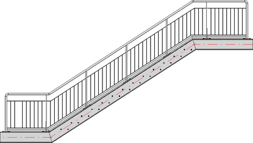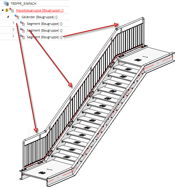 Bei mehreren aufeinander folgenden fluchtenden Trägern werden die Geländerelemente dieser Träger zu einer Segment-Baugruppe zusammengefasst. Dadurch entstehen auch an diesen Trägern durchgehende Handläufe und Knieleisten. Die Aktualisierung und Modifizierung bestehender Geländer (erstellt vor HiCAD 2016 SP2, Version 2102) mit derartigen Bereichen erfolgt weiterhin mit einzelnen Segment-Baugruppen und damit unterbrochenen Handläufen und Knieleisten.
