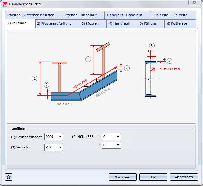 Beispiel Schritt 2 - Setzen der Parameter unter (1) Lauflinie und (2) Pfostenaufteilung