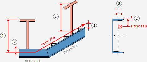 Dieser Wert bestimmt den Abstand zwischen der Trägeroberkante und dem Fertigfußboden. Wird hier ein Wert größer als 0 oder kleiner als 0 eingegeben, dann wird die gesamte Lauflinie nach oben bzw. unten versetzt. Je nach Art der gewählten Profile lassen sich auch unterschiedliche Höhen für den FFB angeben. Dazu werden die gewählten Profile in Bereiche unterteilt. Das erste Profil gehört zu Bereich 1. HiCAD prüft dann, ob das nächste Profil in derselben Ebene liegt. Wenn ja, gehört auch dieses zu Bereich1. Wenn nicht, beginnt mit diesem Profil der nächste Bereich 2 usw. Für jeden dieser Bereiche lässt sich der Wert Höhe FFB separat festlegen.