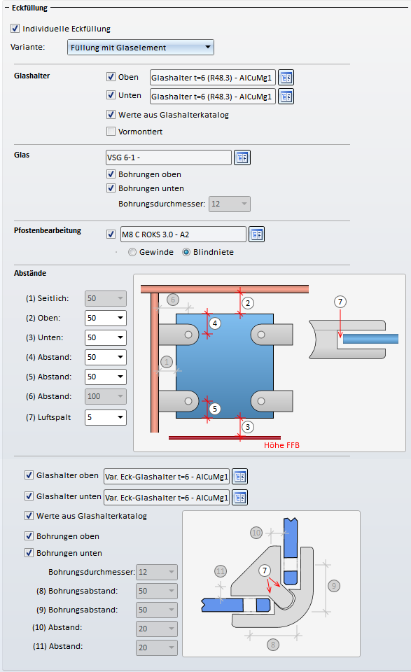 Für Ecken oder Übergänge werden defaultseitig die gleichen Füllungen - wie unter Füllung angegeben - verwendet. Wollen Sie hier individuelle Füllungen verwenden, dann aktivieren Sie die entsprechende Checkbox. Beachten Sie dabei, dass dies nur möglich ist, wenn keine Eck- bzw. Übergangspfosten verwendet werden.