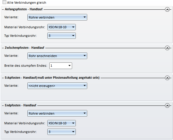Auch wenn Sie hier Alle Pfosten gleich wählen, werden für Eck- und Übergangspfosten die Einstellungen auf den Registerkarten Pfosten - Unterkonstruktion und Pfosten - Handlauf nicht berücksichtigt! Die Anschlüsse an Eck- und Übergangspfosten müssen daher manuell nachbearbeitet werden.