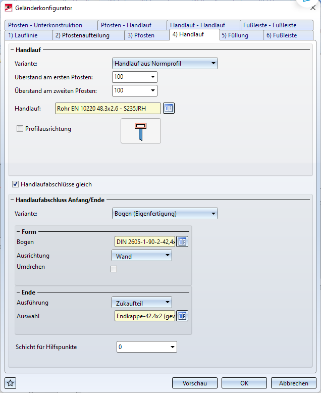 Darüber hinaus haben Sie hier die Möglichkeit, den Abschluss am Anfang und Ende des Handlaufes festzulegen. Verfügbar sind End- und Kugelkappen sowie Bögen mit oder ohne Endkappe bzw. Stahlblech. Bögen können wahlweise an Wand oder Boder ausgerichtet und durch Aktivierung der entsprechenden Checkbox auch umgekehrt werden.