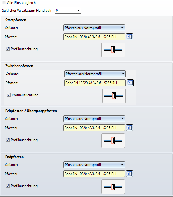 Für Pfosten kann ein seitlicher Versatz zum Handlauf festgelegt werden und durch Aktivieren/Deaktivieren der entsprechenden Checkbox können Sie die Profilausrichtung ändern.