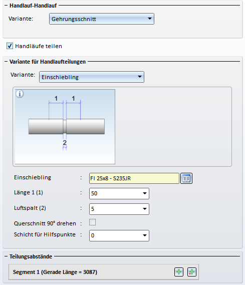 Handläufe können auch geteilt werden, z. B. um bei langen Geländern Einschieblinge oder Flachstahlstöße einzubauen.Dazu aktivieren Sie die entsprechende Checkbox.
