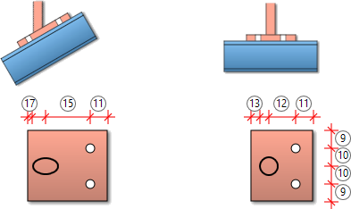 • Abstand der Pfostenachse zum Zentrum der Bohrung (15), (12)