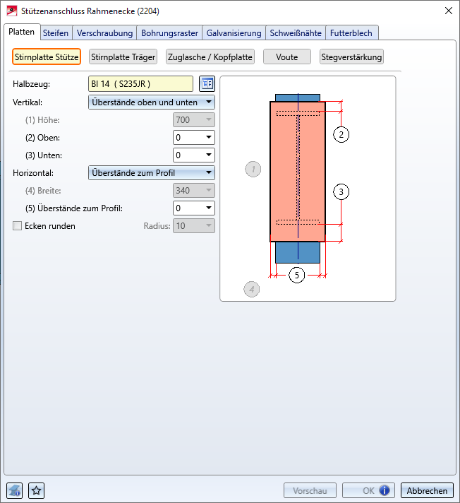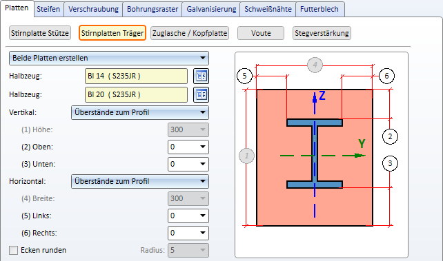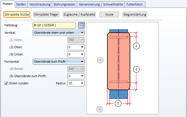 Sollen die Ecken der Stirnplatte gerundet werden, dann aktivieren Sie die Checkbox und geben Sie den Rundungsradius ein. |