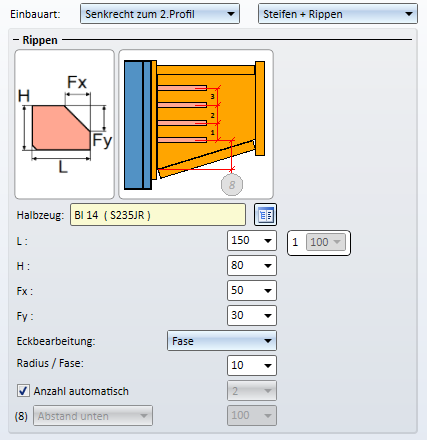 Beachten Sie bitte, dass die Wahl der Einbauart für Steifen und Rippen sich gegenseitig beeinflussen, d. h. in den Auswahlboxen gewählte Option für die Steifen wird für die Rippen übernommen und umgekehrt,