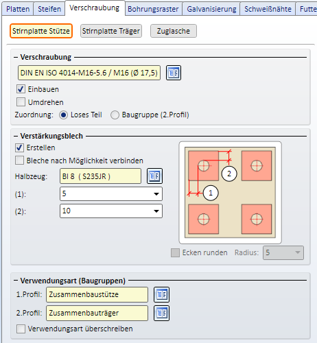 Unter Verwendungsart können Sie festlegen, welche Verwendungsart den Baugruppen des ersten und zweiten Profils zugeordnet werden soll. Ist den Baugruppen der Profile bereits eine Verwendungsart zugeordnet, dann lässt sich über die Checkbox Verwendungsart überschreiben festlegen, ob diese Verwendungsart erhalten oder durch die auf der Registerkarte Verschraubung gewählte Verwendungsart ersetzt werden soll.