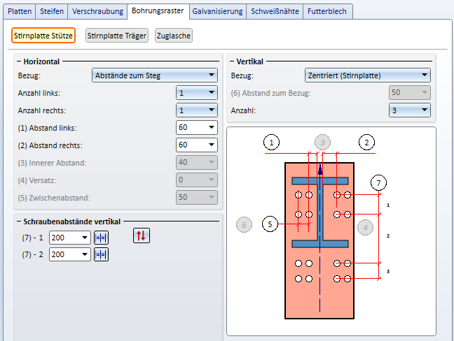 Das Bohrungsraster bestimmt die Anordnung der Verschraubung bzw. des Bohrbildes auf den Stirnplatten. Die Einstellungen können getrennt für die Stirnplatte an der Stütze, die Stirnplatte am Träger und die Zuglasche vorgenommen werden.