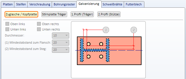 Hier legen sie fest, ob die Stirnplatte, die Zuglasche/Kopfplatte und die Profile mit Löchern für die Galvanisierung versehen werden sollen. Klicken Sie dazu auf die entsprechende Schaltfläche.