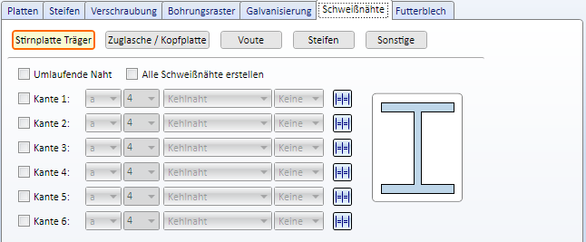 Klicken Sie auf die gewünschte Schaltfläche - oben in der Registerkarte - und legen Sie durch Aktivierung der entsprechenden Checkboxen fest, an welchen Kanten Schweißnähte erzeugt werden sollen. Die Einstellungen für Steifen stehen immer zur Verfügung.