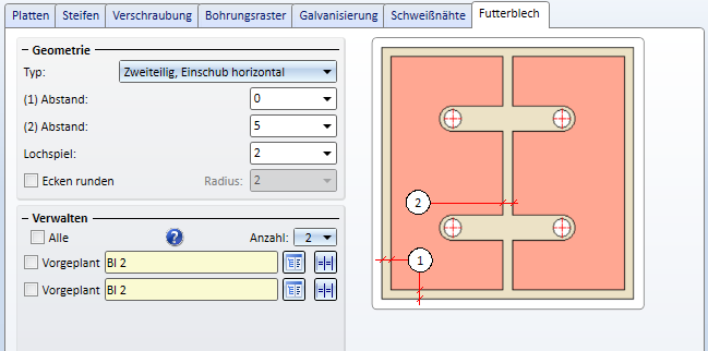 Sollen Futterbleche zwischen der Stirnplatte und der Stütze eingesetzt werden, dann können Sie Anzahl, Typ und Größe dieser Bleche auf der Registerkarte Futterblech festlegen.