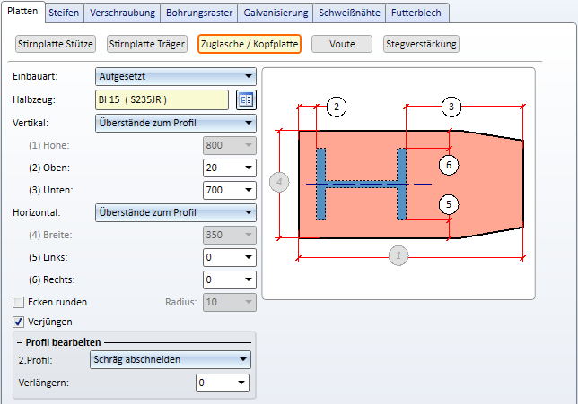Die Bestimmung der Zuglasche/Kopfplatte erfolgt im Wesentlichen analog zur Bestimmung der Stirnplatten. Zusätzlich lässt sich hier unter Einbauart festlegen, ob die Platte eingesetzt (Kopfplatte), aufgesetzt (Zuglasche) oder gar nicht eingebaut werden soll. Soll eine Zuglasche verjüngt eingebaut werden, dann aktivieren Sie die entsprechende Checkbox.