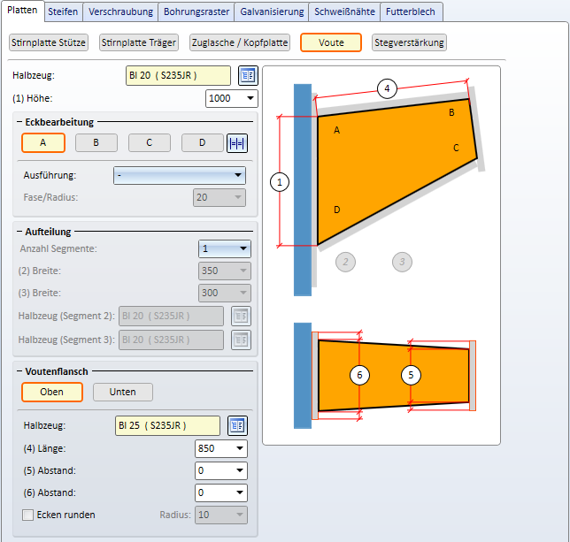 Parameter der Voute sind das Halbzeug, die Höhe sowie die Bearbeitung der 4 Ecken. Dies können nicht bearbeitet, gefast oder gerundet werden. Die Voute kann auch in mehrere (maximal 3) Segmente aufgeteilt werden, d. h. aus maximal drei Voutenblechen bestehen. Dazu geben Sie die gewünschte Anzahl der Segmente sowie deren Breite an und wählen das gewünschte Halbzeug.