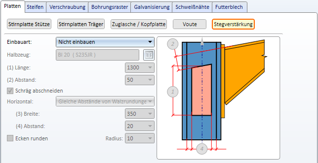 Hier bestimmen Sie die Parameter für die Stegverstärkung. Dabei können Sie unter Einbauart wählen, ob die Stegverstärkung links, rechts, beidseitig oder gar nicht eingebaut werden soll.