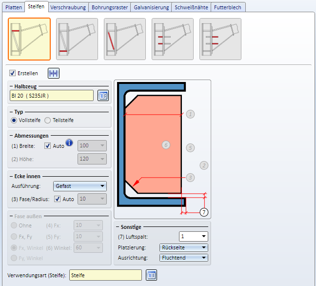Soll eine Steife eingebaut werden, dann aktivieren Sie zunächst die Checkbox Erstellen und wählen Sie dann durch einen Klick auf das Symbol
