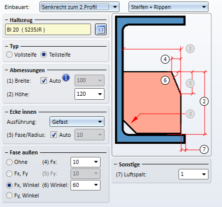 Die Steifen können wahlweise senkrecht zum 2. Profil oder fluchtend zum 1. Profil ausgerichtet werden. Sollen keine Steifen eingebaut werden, dann wählen Sie die Einbauart Nicht einbauen.
