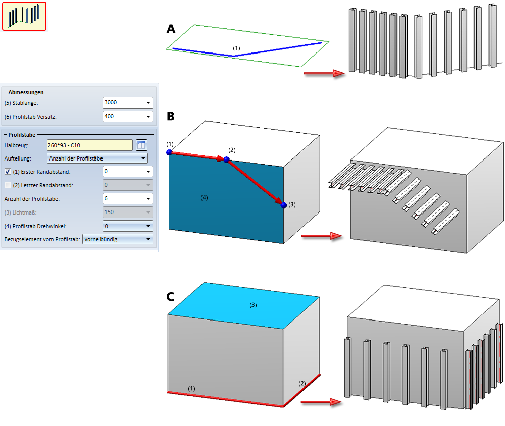 Die Einstellungen in diesem Bereich entsprechen denen der Funktion Profilstäbe zwischen Profilen.