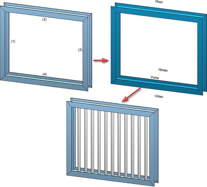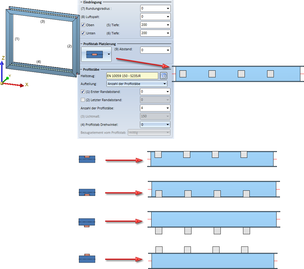 Der abgebildete Rahmen soll gemäß der abgebildeten Einstellungen mit 4 Profilstäben versehen werden. die Draufsicht verdeutlicht die verschiedenen Platzierungsmöglichkeiten.