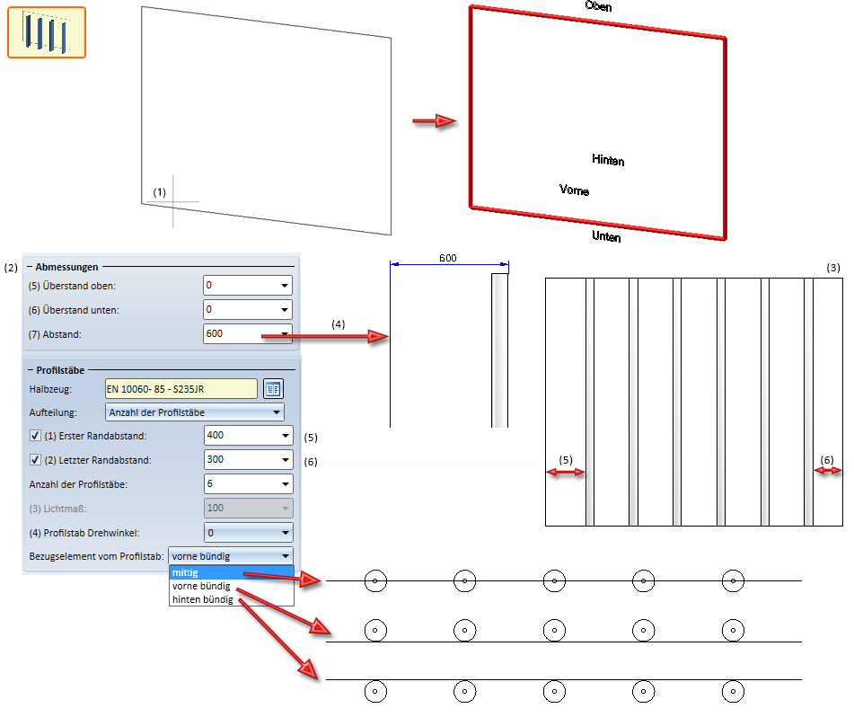(1) Untere Kante einer viereckigen Skizze, (2) Einstellungen, (3) Ergebnis in der Vorderansicht, (4) Abstand in der Seitenansicht bei der Einstellung Bezugselement vom Profilstab: vorne bündig, (5) Erster Randabstand, (6) Letzter Randabstand