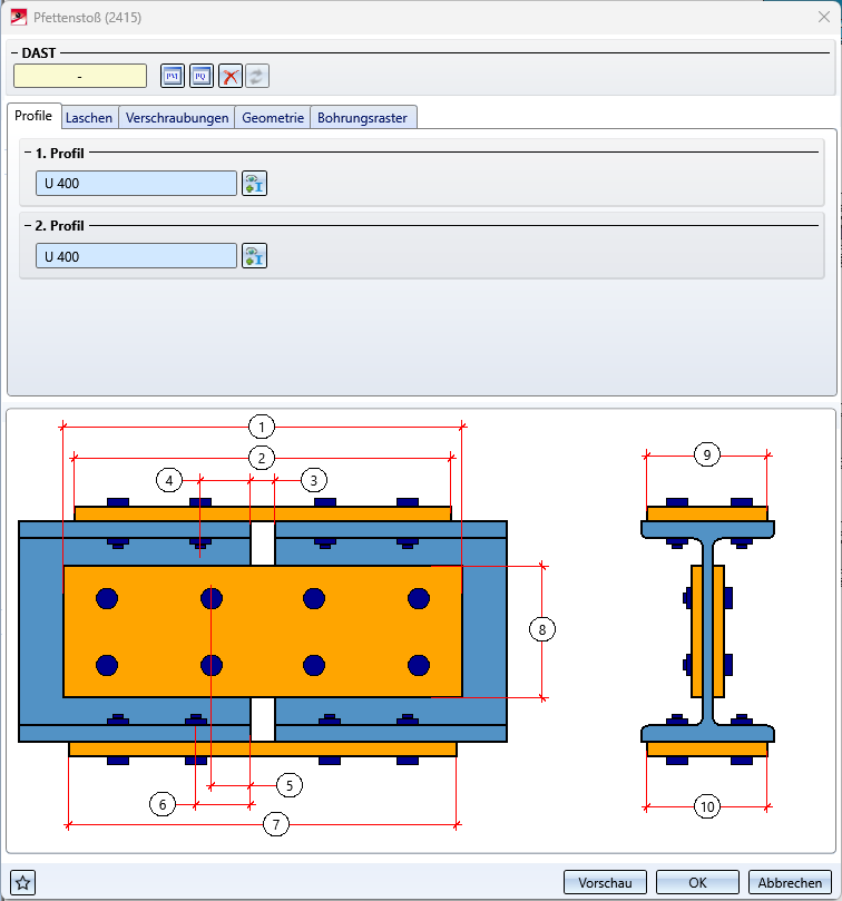 sind mit SP2 durch die neue Designvariante Pfettenstoß gemäß DAST PM/PQ (2415) ersetzt worden. Die Variante verbindet zwei Profile durch einen biegesteifen Stoß. Zugelassen sind I- und U-Profile, die fluchtend sein müssen. Der Einbau kann benutzerdefiniert oder - bei entsprechenden Profilen - anhand einer Tabelle gemäß DAST PM oder PQ erfolgen.