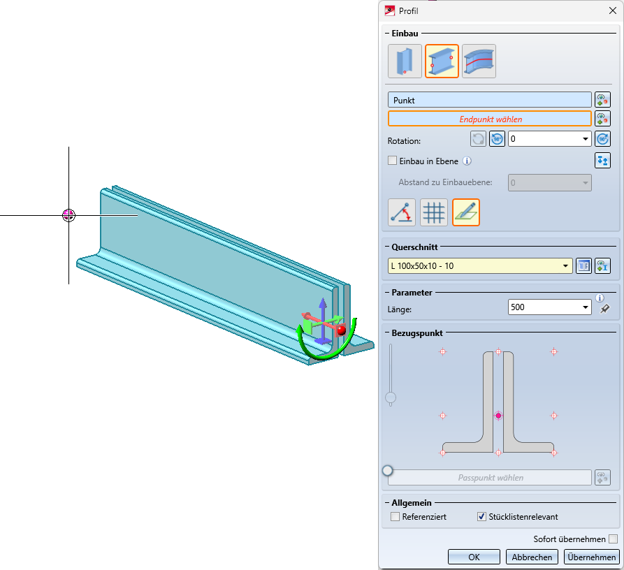 Sobald Sie die erforderlichen Parameter eingegeben haben, wird eine Vorschau des Profils angezeigt. Neu ist auch, dass jetzt ein Passpunkt gewählt werden kann, um den Einbau zu vereinfachen.