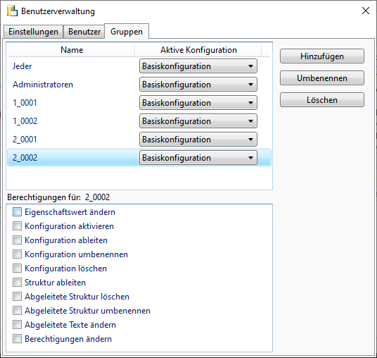Im Konfigurationseditor können Sie verschiedene Benutzerkonfigurationen mit der Funktion Konfiguration ableiten anlegen. Eine dieser Konfigurationen sowie die Basiskonfiguration oder die Hauptgruppenkonfiguration kann dem Benutzer in der Spalte Aktive Konfiguration zugewiesen werden.