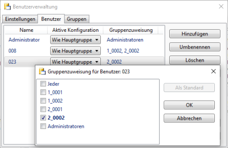 Die Rechte des Benutzers werden über die Gruppenzugehörigkeit geregelt. Dabei kann ein Benutzer mehreren Gruppen angehören. Mit der Funktion Gruppenzuweisung wählen Sie die Gruppen für den Benutzer aus. Die Hauptgruppe des Benutzers wird hervorgehoben, wenn Sie, nach dem Markieren der Gruppe, die Schaltfläche Als Standard aktivieren. Die Hauptgruppe steht bei der Konfigurationsauswahl des Benutzers zur Verfügung. Mit OK verlassen Sie die Gruppenauswahl.