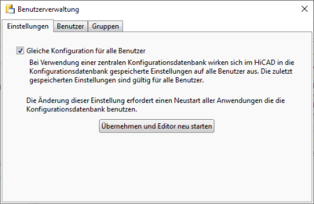 Die integrierte Benutzerverwaltung erlaubt das Anlegen und Löschen von Benutzerprofilen, sowie das Entfernen und Übernehmen von benutzerspezifischen Werten in ein anderes Benutzerprofil. Ein Administrator kann so z.B. vom Konfigurationsmanagement verwaltete Einstellungen innerhalb von HiCAD vornehmen, die zunächst unter seinem Windows-Benutzerprofil gespeichert werden. Diese Einstellungen können später als Firmenstandard in das Administratorprofil übernommen werden und gelten so für alle Benutzer.
