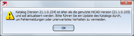 Wird HiCAD mit einem Katalogverzeichnis gestartet, das älter ist (z. B. HiCAD 2020.1 mit Katalog 2020.0), dann erscheint eine entsprechende Meldung, z. B.: