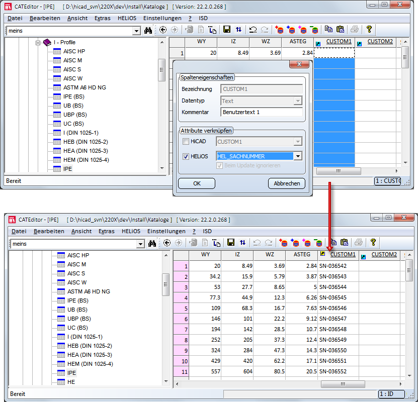 Normteile und HELiOS (PDM)Menü HELiOSAttributverknüpfung von Spalten
