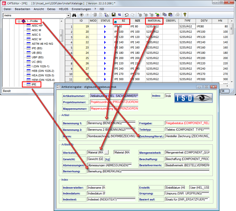 Im Prinzip ist jede Tabellenzeile im Katalogeditor, d. h. jeder Datensatz, ein Bauteil, d. h. ein Artikel in HELiOS. Dabei stellt sich die Frage, welche Informationen des Katalogeditors welchem Artikelattribut in HELiOS zugeordnet werden.