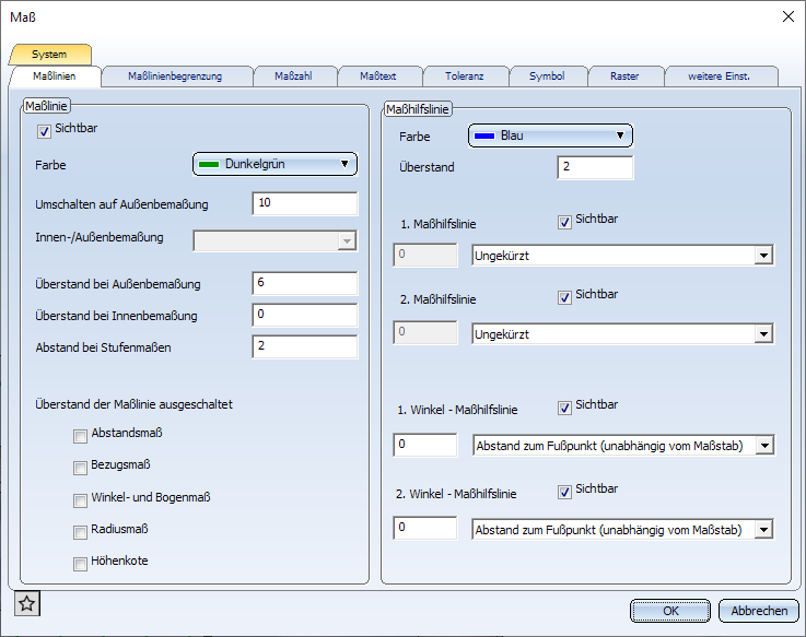 Die Registerkarte System wird nicht angezeigt, wenn Sie nachträglich die Einstellungen einzelner Maße oder Maßelemente ändern wollen.