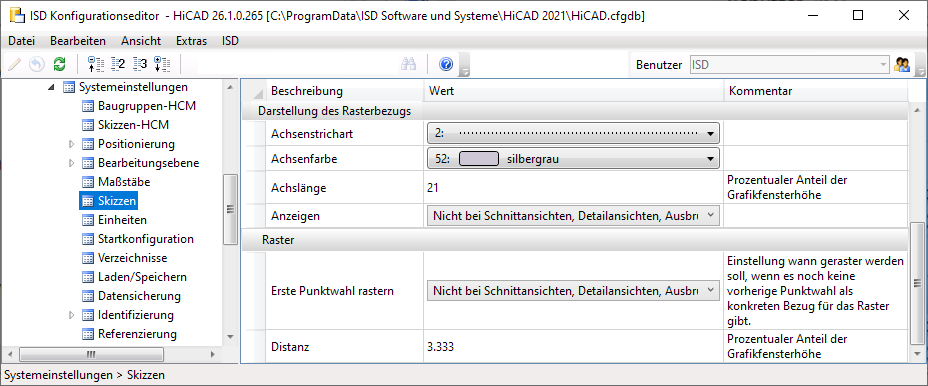 Die Darstellung des Rasterbezugs beim Erstellen von Skizzen und 3D-Skizzen mit dem Skizzierer lässt sich im Konfigurationsmanagement einstellen unter Systemeinstellungen > Skizzen und dort im Bereich Darstellung des Rasterbezugs.