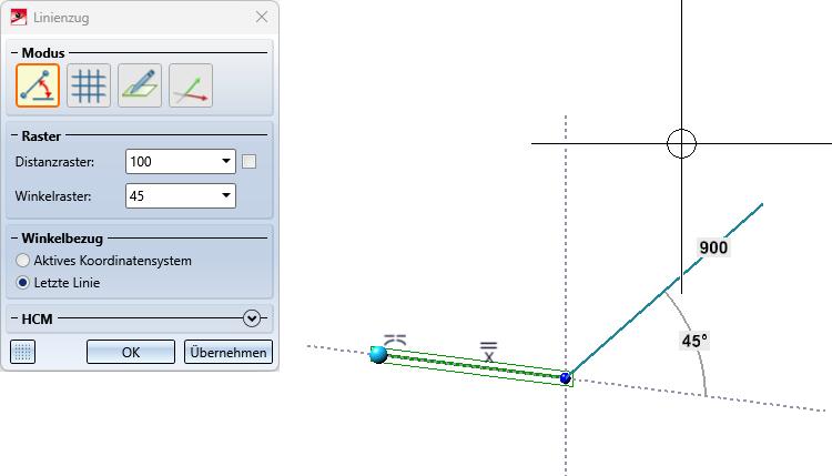 - Beim Skizzieren von Linienzügen, Kreisen, Bögen und Ellipsen können automatisch auch die entsprechenden HCM-Bedingungen erzeugt werden. Die einzelnen Elemente des Linienzuges sind dann durch entsprechende Maß- und Lagebedingungen miteinander verknüpft. Den Automatismus können Sie direkt beim Zeichnen der Skizzenelemente aktivieren, z. B.