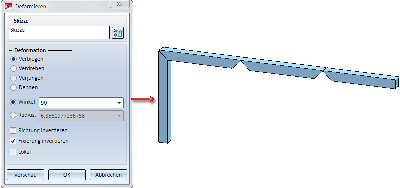Als Skizze wird die Skizze unter (2) gewählt. Die Verbiegung soll 90° betragen. Die Aktivierung anderer Optionen ist hier nicht erforderlich. In diesem Fall liefern die lokale und globale Verbiegung dasselbe Ergebnis.