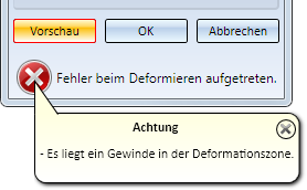 am OK-Button angezeigt. - Die von der Verbiegung betroffene Zone darf keine Gewindehülsen und Normbearbeitungen enthalten. Ist dies der Fall wird eine entsprechende Meldung angezeigt.