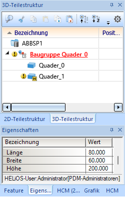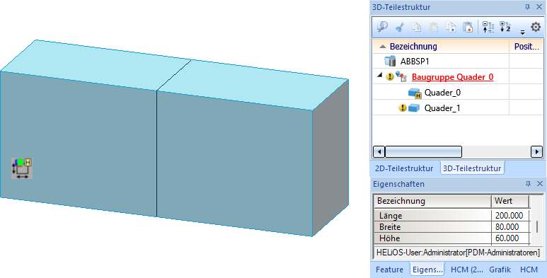 Wandelt man jetzt den 2. Quader in ein Baugruppenhauptteil um, dann wird die Hauptteilkennung des 1. Quaders aufgehoben und die Baugruppenabmessungen ändern sich.