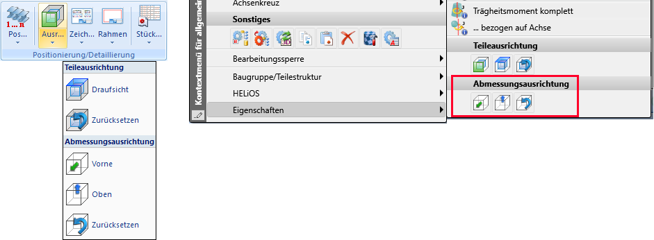 Das manuelle Setzen der Abmessungsausrichtung erfolgt mit den Funktionen unter Konstruktion > Ausr... > Abmessungsausrichtung oder im Kontextmenü für Teile und Baugruppen unter Eigenschaften.