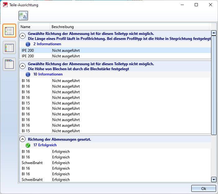 Ausrichtung nicht für alle Teile vergeben werden, dann erfolgt eine entsprechende Meldung, z.B.