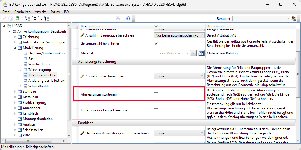 Durch Aktivierung dieser Checkbox lassen sich die Abmessungen den Attributen Länge, Breite, Höhe nach Größe sortiert zuordnen. Das heißt, der größte Wert wird der Länge zugeordnet, der kleinste der Höhe. Defaultmäßig ist die Checkbox inaktiv. Das Einschalten der Sortierung wirkt sich erst nach einem Neustart von HiCAD aus.